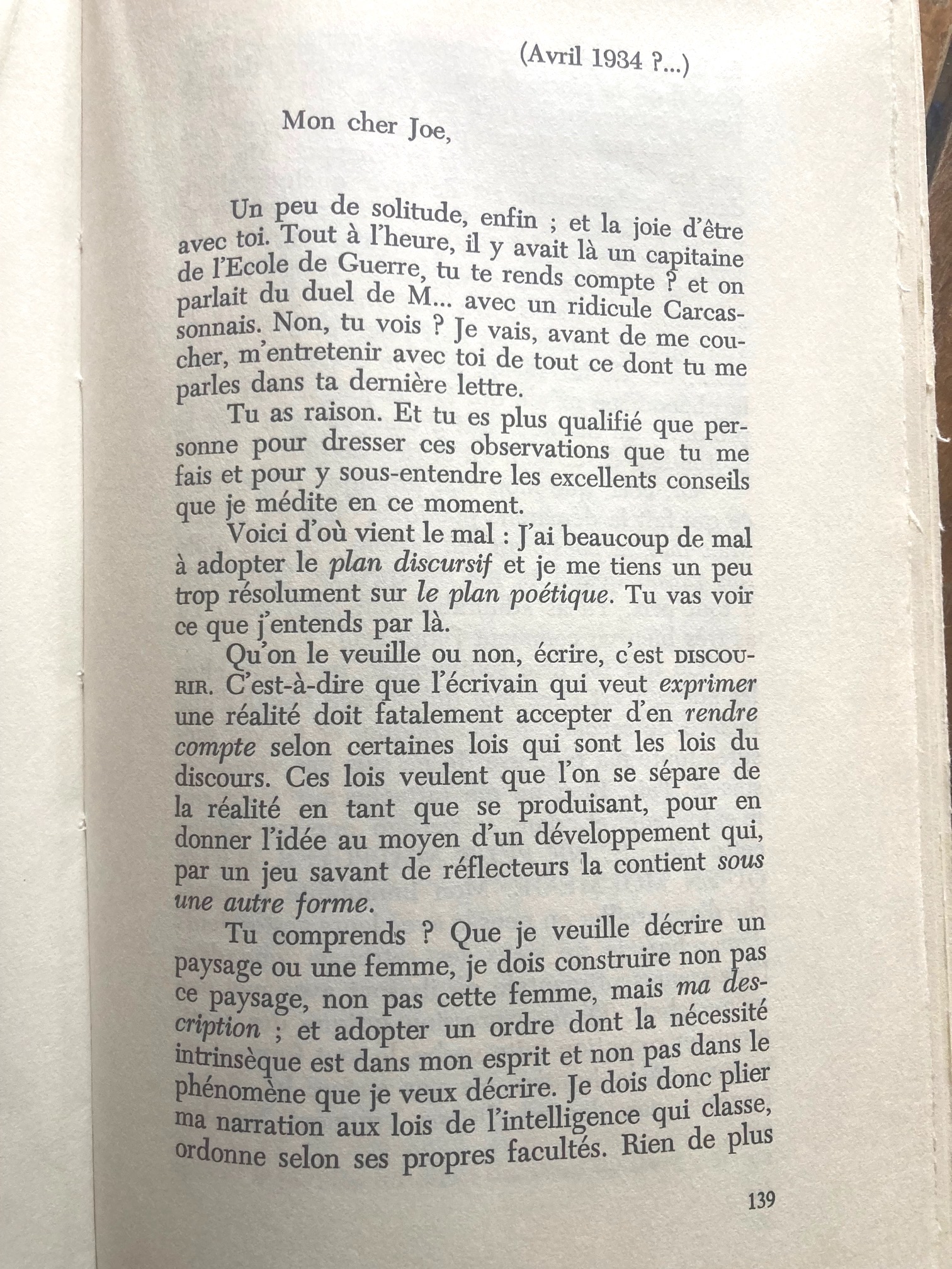 Sa poésie, ses livres publiés (et refusés chez Gallimard, mais publiés à ses frais par quelque éditeur mineur) sont alors nébuleux, obsessionnels et clairvoyants comme un délire sous LSD. Son ami Carlo Suarès s’efforce donc de le conduire sur le chemin d’une littérature plus claire, ou disons plus « lisible ». Il lui parle méthode, décrivant pour lui un « plan discursif » sur lequel Joë pourrait remarcher. « J’ai beaucoup de mal », lui répond son ami. Puis ceci, lisible ci-dessous. Admirable.