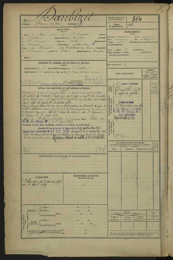 C’était 1916, janvier 1916, donc. Justin fut affecté au 81e puis au 143e régiment d’infanterie, d’après ses papiers. On l’envoya à Verdun, où il fit toute la bataille, indemne. (Démobilisé, Justin fit, dit-on, une belle carrière de cantonnier à Saint-Bonnet-de-Salers, où le café-étape familial prospérait sous l’autorité des femmes : on raconte dans la famille restée au patelin qu’il chantait comme un pinson et qu’il aimait faire rire la compagnie.)