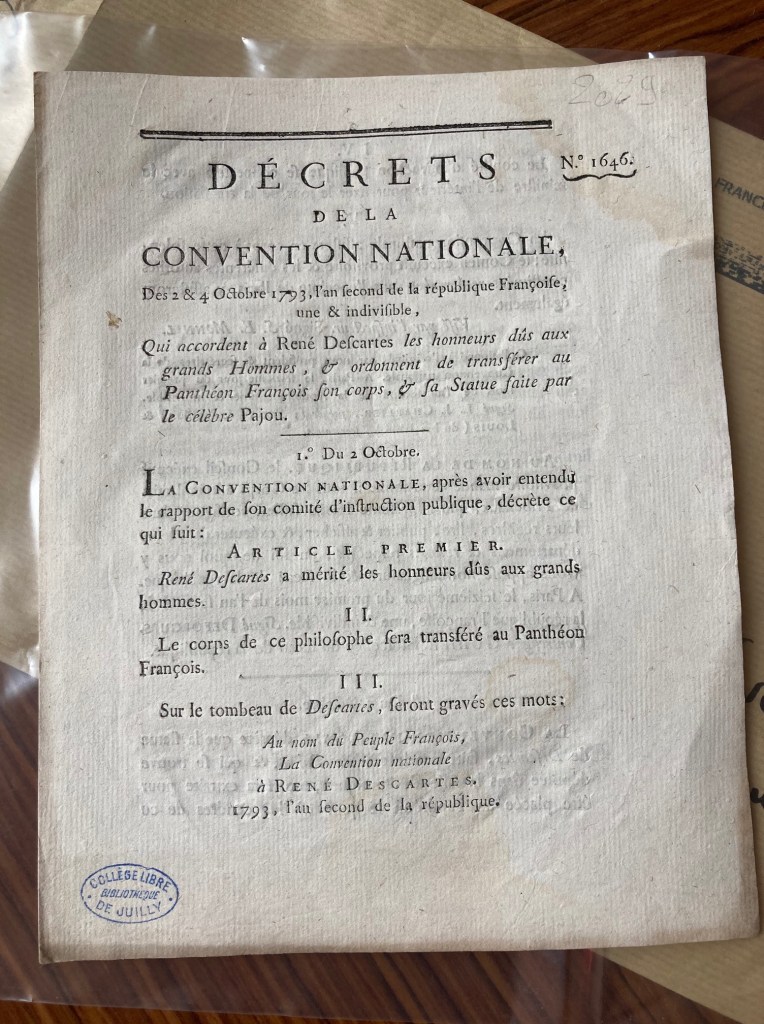 Il s’agit donc d’un décret d’octobre 1793. Le principe autour duquel les députés d’alors articulaient leur action était la raison raisonnante, la lumière de l’esprit humain. Qui de mieux, alors, pour incarner cette puissance de penser, que le ci-devant chevalier Descartes ? Locataire, à Amsterdam, d’une chambre obscure dans le quartier des bouchers et des synagogues, solitaire, entêté, cet homme avait désarticulé poliment la pensée magique régnant alors sur l’Occident pour la ré-assembler méthodiquement et lui donner une force de propulsion qui avait, dès lors, balayé le monde. La jeune République française aimait les hommes comme ça. Alors Marie-Joseph Chénier, poète et député, se chargea de présenter l’idée à ses collègues députés réunis dans la Salle du Manège de transférer les restes de Descartes au Panthéon, le temple national qui venait d’ouvrir ses lourdes portes.