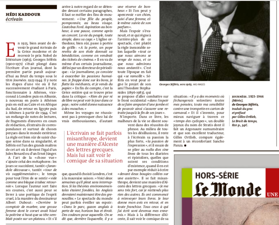 Alors pour se convaincre de sauver encore ce qui peut l’être, pour s’efforcer d’aimer Georges Séféris, le beau livre paru dans une traduction courageuse de Gilles Ortlieb me paraît indispensable. L’écrivain Hédi Kaddour a donné hier dans Le Monde des Livres, et bellement, comme d’habitude, des raisons impérieuses de l’acheter.
